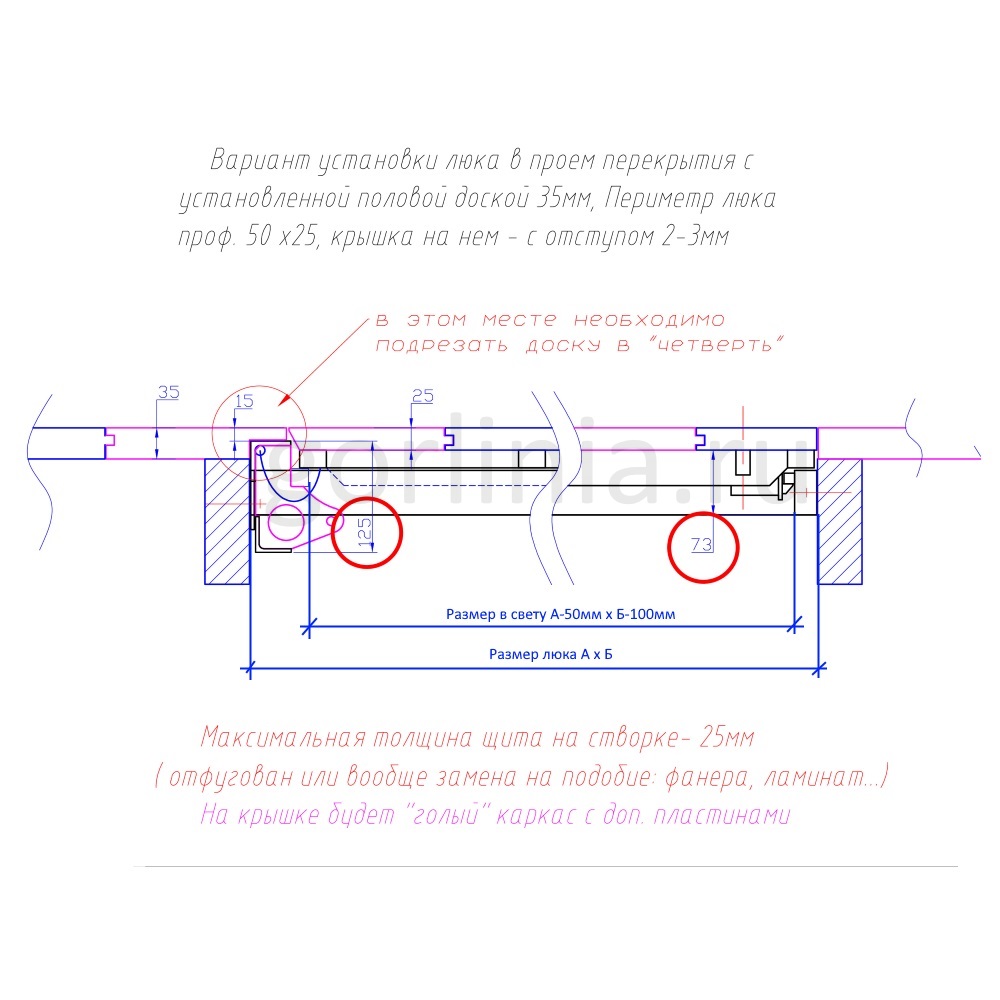 Со стороны шарниров на паразитку стелят деревянный пол до 35 мм с подрезкой в четверть 15 мм, отступом 4-6 мм от края полки по месту. Дверь обшивается доской 25 мм с запилом торца на угол, как на схеме, для свободного хода двери на газовых амортизаторах до угла распахивания 88° при зазоре 2-4 мм на петлевым узлом.