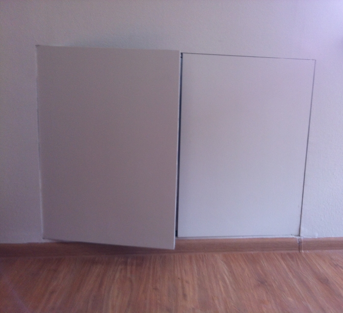 Конструкция крепится в каркас перегородки, выставляется в уровень финишного слоя, далее декорируется материалом общей отделки поверхности. Маяками служит профиль полотна, заполненного гипсоволокном.