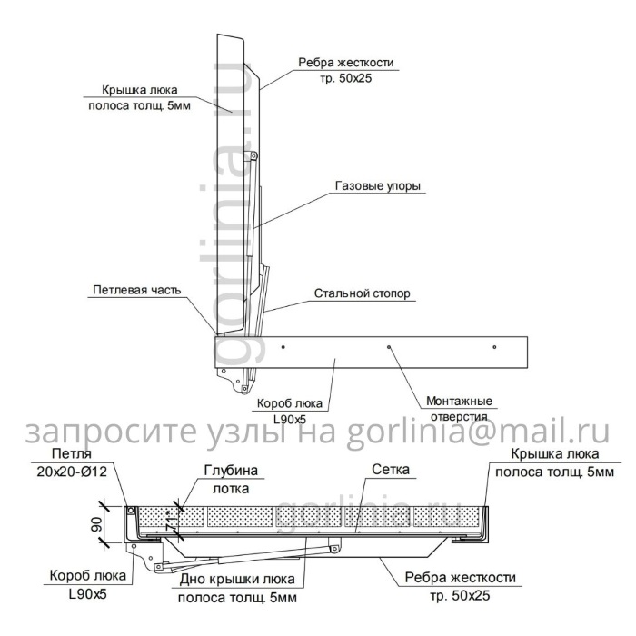 Обечайка сварена из углового профиля горячего проката с толщиной стенки 5 мм; корыто - из листового проката 3 мм, усилено снизу обвязкой из балки 50х25. Сварка аргонно-дуговая сплошным проваром с присадками меди.