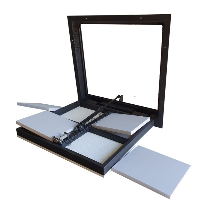 Конструкция смещенного за ось открывания узла шарнира позволяет изготовителю сформировать опорную поверхность по стороне петли 800, сохранив при этом ширину лаза 800 для устройства лаза в погреб с приставной лестницей.