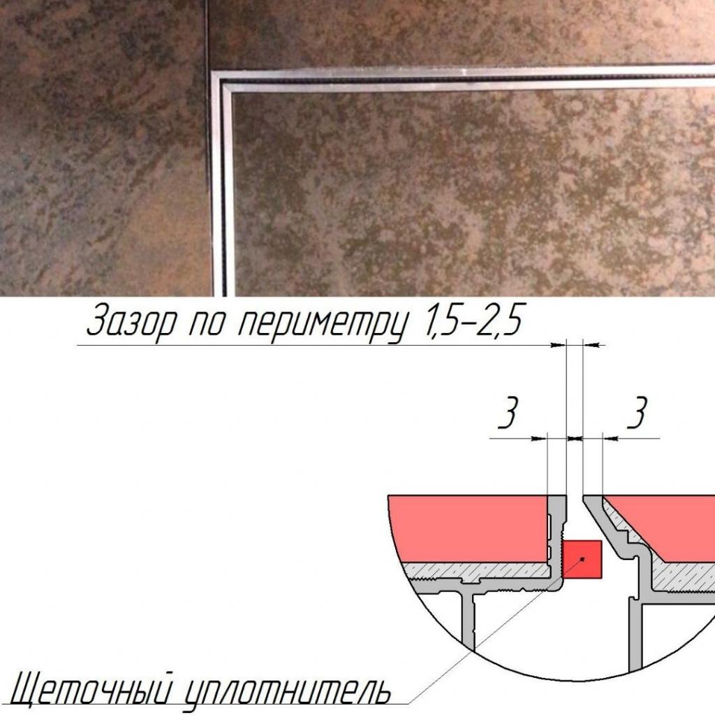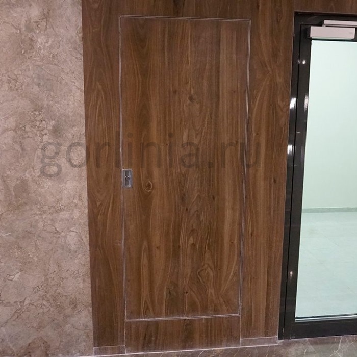 В скрытой коробке с порогом проложен огнеупорный термоактивный уплотнитель. Съемное полотно с левым или правым открыванием на себя подшивается с тыльной стороны вторым листом ГСП-DF с закладкой внутрь базальтовой плиты. Створка навешивается на скрытые осевые петли, регулируется для корректировки положения дверного шва.