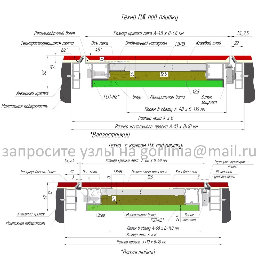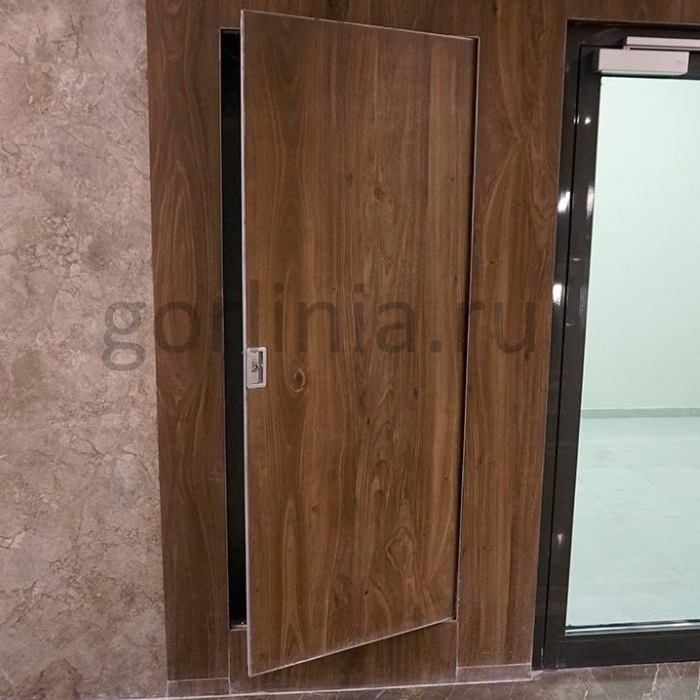 Грузоподъемность осевой петли и коробчатого профиля рамы: ≤60 кг облицовочного материала на 1 м² створки. Короб с порогом без наличника. Открывание симметричное "на себя" за ручку или нажатием.